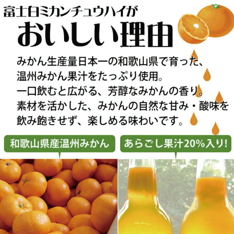 アイスで飲むと果汁感が増し、後味のスッキリ感が増すという声が多い一方、ホットで飲むとまろやかさや甘味が増すと言う感想が! 温度によって変わる味わいをお楽しみいただけるのも、富士白ミカンチュウハイの面白さの一つです。
