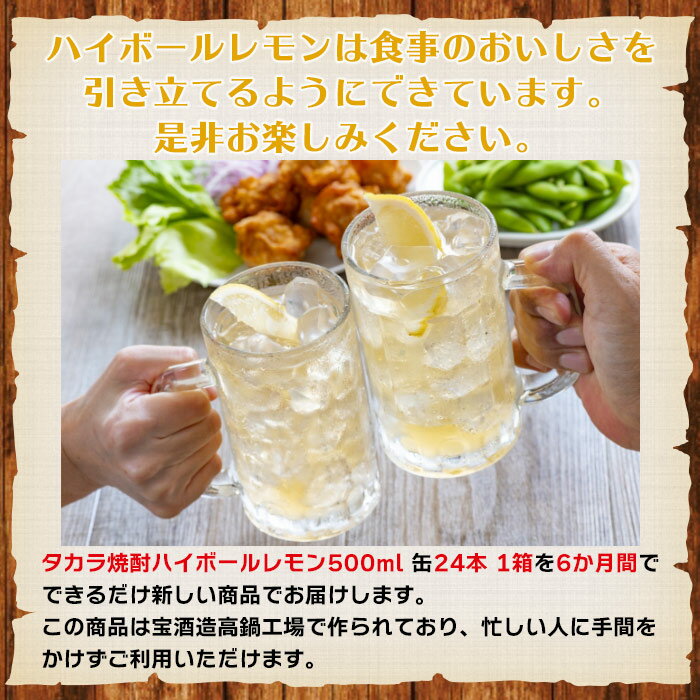 名称 呑んべえ 6か月定期便(タカラ 焼酎ハイボール レモン 500ml×24本) 内容量 500ml×24本(6か月定期便) 原材料名 焼酎、レモン果汁、糖類、香料、酸味料、カラメル色素 保存方法 常温 配送方法 宅配便(常温) 提供事業所 水町酒店 / 宮崎県児湯郡高鍋町 ギフト対応 のし等のギフト対応をしておりません。
