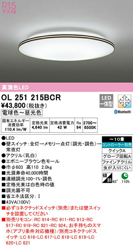 オーデリック OL251215BCR LEDシーリングライト 10畳用 R15高演色 CONNECTED LIGHTING LC-FREE 調光・調色 Bluetooth対応 照明器具 天井照明 居間 リビング 応接 シンプル 【〜10畳】