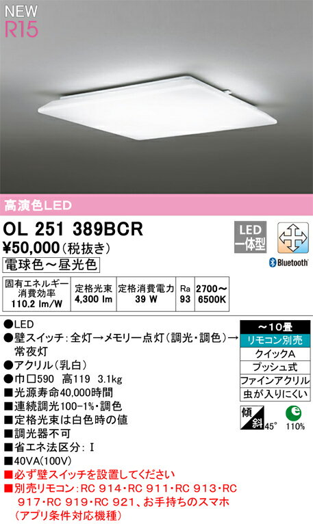 ●商品の関連商品や機能説明などPC用ページに切り替えてご確認下さい [ 人気 商品 検索 画面 はこちらから ] ●関連商品 調光調色シーリングライトOL251349R アクリル乳白 高演色LED 電球色〜昼光色ツバ付丸形引掛シーリング取付 リモコン付属〜14畳36,410円調光調色シーリングライトOL251603R アクリル乳白 高演色LED 電球色〜昼光色ツバ付丸形引掛シーリング取付 リモコン付属〜12畳31,020円調光調色シーリングライトOL251389R アクリル乳白 高演色LED 電球色〜昼光色ツバ付丸形引掛シーリング取付 リモコン付属〜10畳28,270円調光調色シーリングライトOL251604R アクリル乳白 高演色LED 電球色〜昼光色ツバ付丸形引掛シーリング取付 リモコン付属〜8畳25,630円調光調色シーリングライトOL251349BCR アクリル乳白 高演色LED 電球色〜昼光色ツバ付丸形引掛シーリング取付 Bluetooth対応機種〜14畳36,960円 調光調色シーリングライトOL251603BCR アクリル乳白 高演色LED 電球色〜昼光色ツバ付丸形引掛シーリング取付 Bluetooth対応機種〜12畳30,470円調光調色シーリングライトOL251389BCR アクリル乳白 高演色LED 電球色〜昼光色ツバ付丸形引掛シーリング取付 Bluetooth対応機種〜10畳27,830円調光調色シーリングライトOL251604BCR アクリル乳白 高演色LED 電球色〜昼光色ツバ付丸形引掛シーリング取付 Bluetooth対応機種〜8畳25,080円