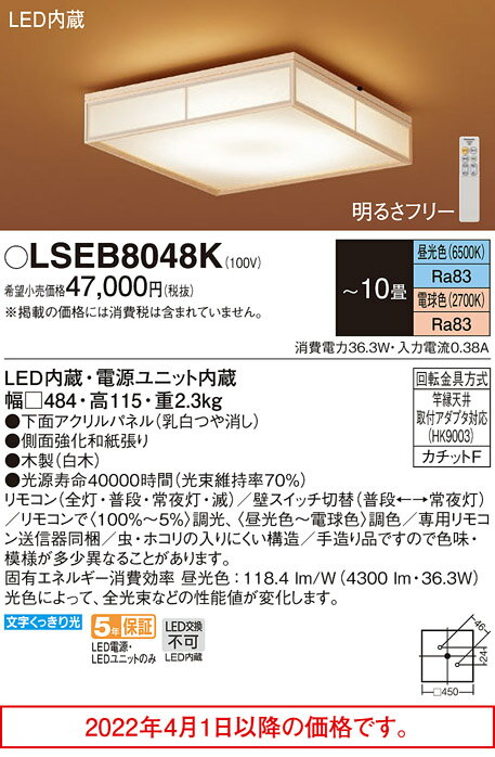 パナソニック LED 和風シーリングライト LSEB8048K (LGC45811K相当品) 10畳用調色 (カチットF) Panasonic