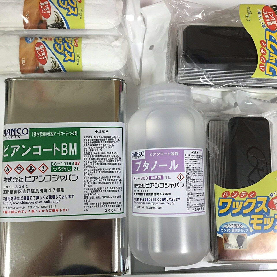 初心者向け10点セットビアンコ—トBシリーズ 30畳用"> ツヤあり・UV対策あり 30畳用44,800円(税込)詳細はこちら 30畳用"> ツヤあり・UV対策なし 30畳用37,590(税込)詳細はこちら 30畳用"> ツヤなし・UV対策あり 30畳用52,290円(税込)詳細はこちら 30畳用"> ツヤなし・UV対策なし 30畳用41,790円(税込)詳細はこちら 【ビアンコートBかんたん施工セット】商品名【ビアンコートBかんたん施工セット】艶無/UV対策あり 2L(100平米対応)セットセット内容 ●一液常温硬化型ハードコーティング剤『ビアンコートB 艶無UV対策あり 2L缶』×1 ●希釈用ブタノール 1000mlポリ容器×1●施工用推奨モップ(ラグロン社製)×2●推奨モップ替え布×2●施工方法動画DVD×1枚 成分 有機・無機ハイブリッドコーティング剤(固形分 25%以上)・テトラエトキシシラン(CAS No. 78-10-4) エチルポリシリケート(CAS No.11099-06-2) 27%以上 ・3-メトキシ-3-メチル-1-ブタノール(CAS No.56539-66-3) 50% 使用量の目安 100mlあたり5平米(ただし、吸収性の高い素材については二度塗りを行うことがあるため2.5平米程度)使用方法【下地調整】●素地に傷や変色がある場合には予め補修しておく。