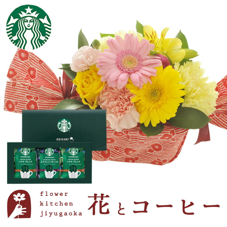 花とコーヒーのセットあめ玉アレンジメントとスターバックスコーヒーギフトセット 【送料無料 北海道・沖縄・離島お届け不可】生花 メッセージカード 花 プレゼント 贈り物誕生日 記念日 お祝い 送別 スタバ FKAASW