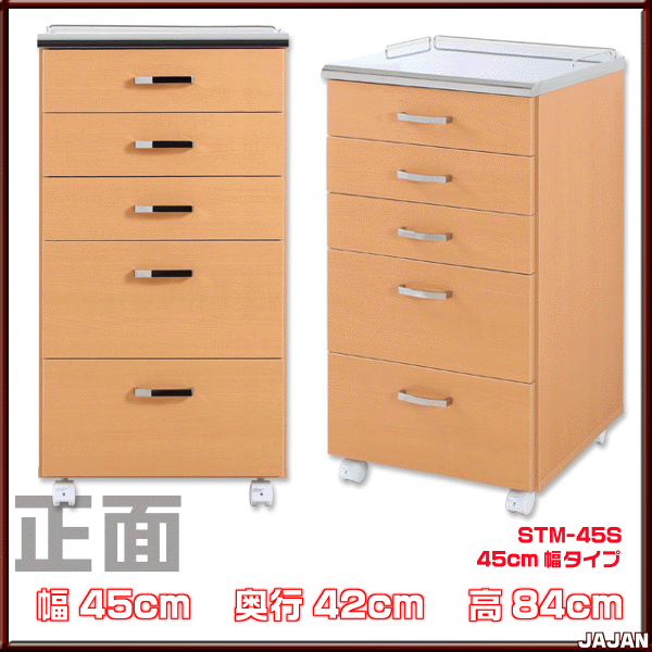 引出しは全段スライドレールタイプで、移動時に開いたりしないようマグネットキャッチも付いています 小物の収納に便利な小引き出しが3杯と、大きな物も余裕で収納可能な大引出し2杯付きで、あれこれ散らかりがちな様々な小物類をスッキリ分別収納いたします 小引き出しは、お玉やフライ返し等も余裕で収納できます 大引き出しは深さを利用し、オナベやフライパン等の収納にも役立ちます A4サイズのバインダーが入るサイズなので、医療器具やカルテなどを入れておくことも可能です 奥行きは42cmと取り回しの良いショートタイプ ステンレス天面は高級スチール素材の18系ステンレスを採用したハイグレードタイプで、医療現場でのハードなご使用にもオススメ! キッチンであっつ熱のオナベやヤカン、クラフト作業のハンダゴテ等を直に置いても大丈夫です 天板には落下防止バーも付いており、そのまま作業スペースとして使ったり、ちょっとした書き物等にも大変便利です! 医療現場でのご使用に耐えるプロユース仕様だから、キッチンや工場等での作業台としてや趣味の工作の補助台件収納等、幅広い分野でお使いいただけます 背面化粧仕上げですので、お仕事の場等でもそのままお使いいただけます 安価でありながら高品位&耐久性を持つ仕様のステンレス天板 プロユースキャビネットです! ■商品詳細■ 商品サイズ 奥行き 幅 高さ 42cm 45cm 84cm 付属品 取っ手・キャスター 落下防止ガード 製品材質 本体:プリント化粧繊維板 天板:18系ステンレス 引出し 小引出し3杯・大引出し2杯 静止耐荷重 天板30kg・引出し5kg 生産国 日本国 安全機構 落下防止バー・ブレーキ付きキャスター マグネットキャッチ付き引出し 注:ガード・取っ手・キャスターはお客様取り付けとなります 注:この商品は背面化粧されています 注:室外でのご利用はしないで下さい ■全体図■ ↑詳細サイズはコチラ ↑お仕事に合せてグレードUP! 奥行55cmサイズも有 ステンレス天板&樹脂塗装のハイグレードタイプはコチラ ↑気軽にお使いになるなら廉価版がオススメ! ポリ合板天板の廉価グレードタイプはコチラ ステンレ医療用として開発されたキャスター付きメディカルワゴンです! 工場やキッチン等の隙間に隙間収納としてのご利用もオススメ! 特に歯科医院さんでのご利用に便利なサイズのデンタルワゴン・デンタルキャビネットです 送料無料&代引き手数料無料にてお届けいたします!★