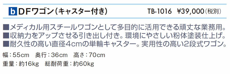 TB-1016 DFワゴン メディカル用スチールワゴンとして多目的に活用できる頑丈な業務用。