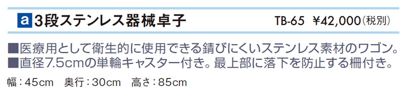 TB-65 3段ステンレス器械卓子 医療用として衛生的に使用できる錆びにくいステンレス素材のワゴン。