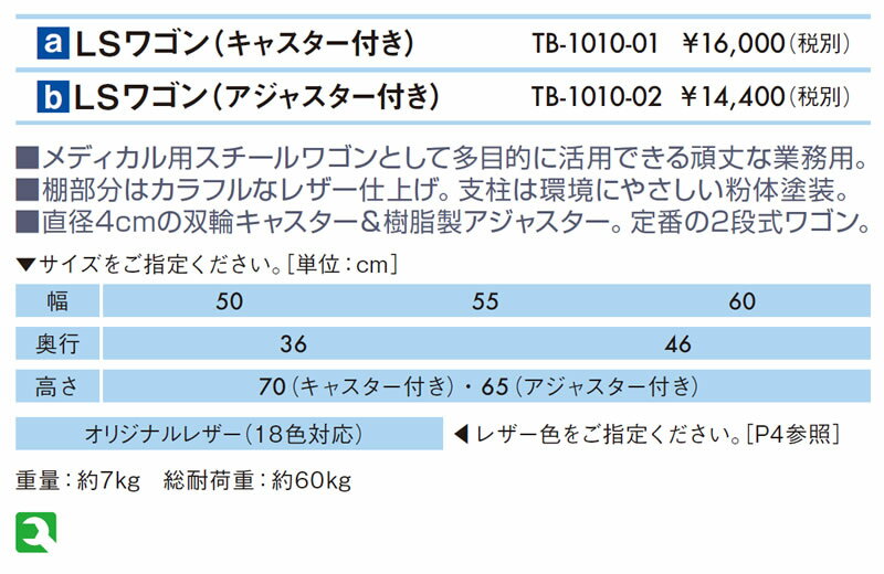 TB-1010-02 LSワゴン(アジャスター付き) メディカル用スチールワゴンとして多目的に活用できる頑丈な業務用。