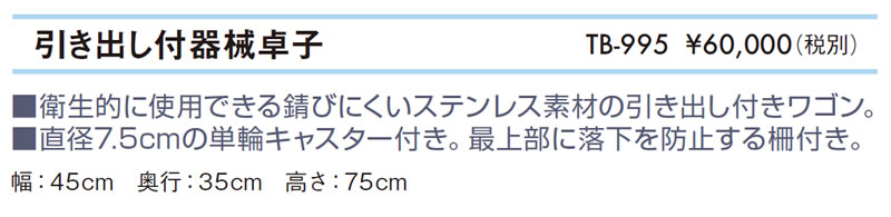 TB-995 引き出し付器械卓子 衛生的に使用できる錆びにくいステンレス素材の引き出し付きワゴン。