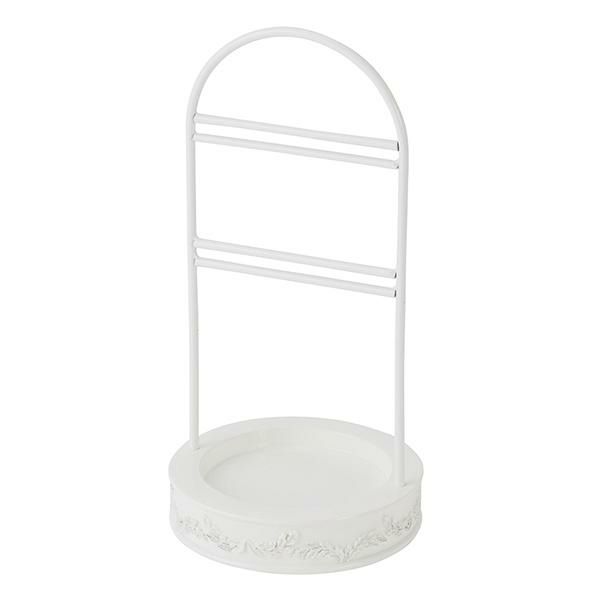 ホワイトを基調にさりげなくデザインされたリーフがアクセントのスタンドは、見やすくピアスやイヤリングを掛けやすいスリット構造。