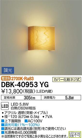 照明 おしゃれ かわいい 屋内 ライト大光電機 DAIKO 調光ブラケットライトDBK-40953YG アクリル 透明突板・メイプル 上下面開放 LED電球色 白熱灯60W相当