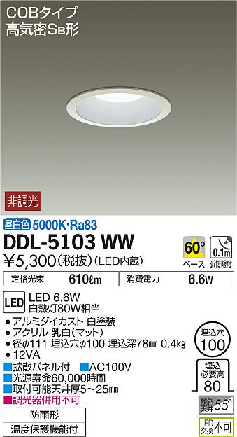 照明 おしゃれ かわいい 屋内大光電機 DAIKO ダウンライトDDL-5103WW 白塗装 LED昼白色 屋内・屋外兼用 白熱灯80W相当 埋込穴φ100mm 埋込深78mm